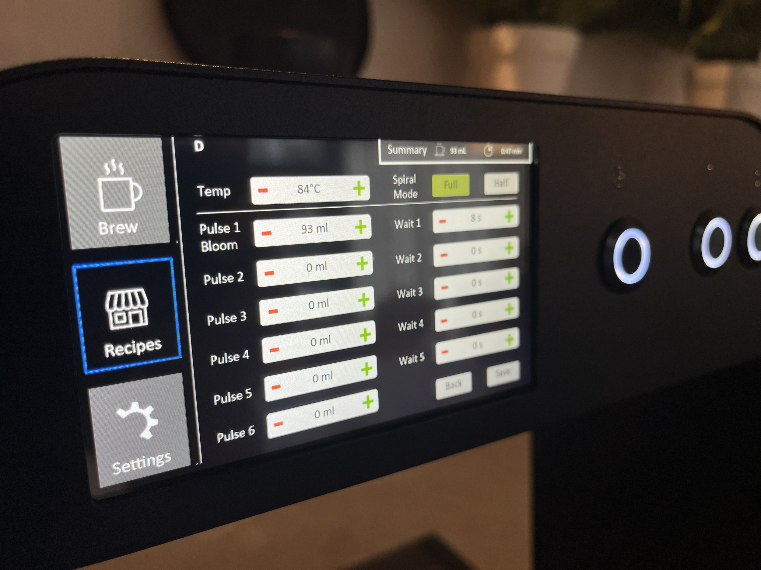 The barista-facing side of the machine features a high-reliability touchscreen designed for intuitive operation and precise control. Users can create, customize, and save up to 16 recipes, with full control over critical brewing parameters—including temperature, number of pouring pulses, volume, dwell time between pours, and spiral pouring patterns.